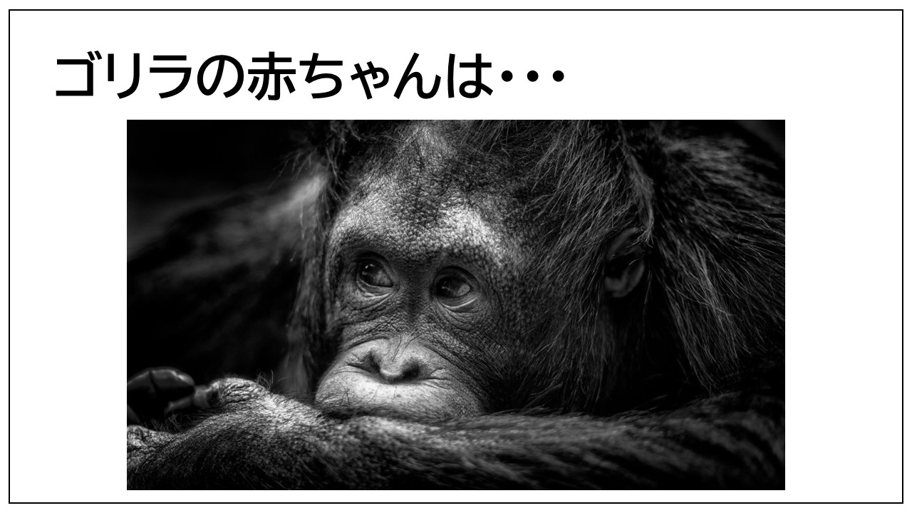 さて,スライドにはゴリラの赤ちゃんの写真を出しましたが,「ゴリラの赤ちゃんは・・・」。 ・・・には,なんと続くと思いますか。