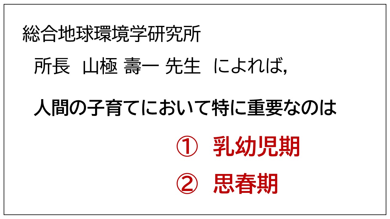 そして,山極先生がおっしゃるに子育てにおいて次に大切なのが,「思春期」なんだそうです。