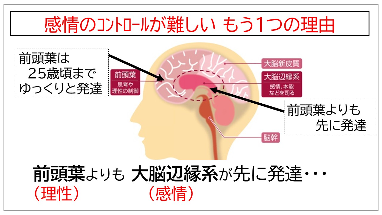 一方で,「理性的な判断や感情のコントロール=思考を司る」を行うところは脳の前方にある「前頭葉(前頭前野)」というところです。前頭葉(前頭前野)は,大脳辺縁系よりも遅れて発達し,20代半ば,25歳頃まで成熟し続けます。