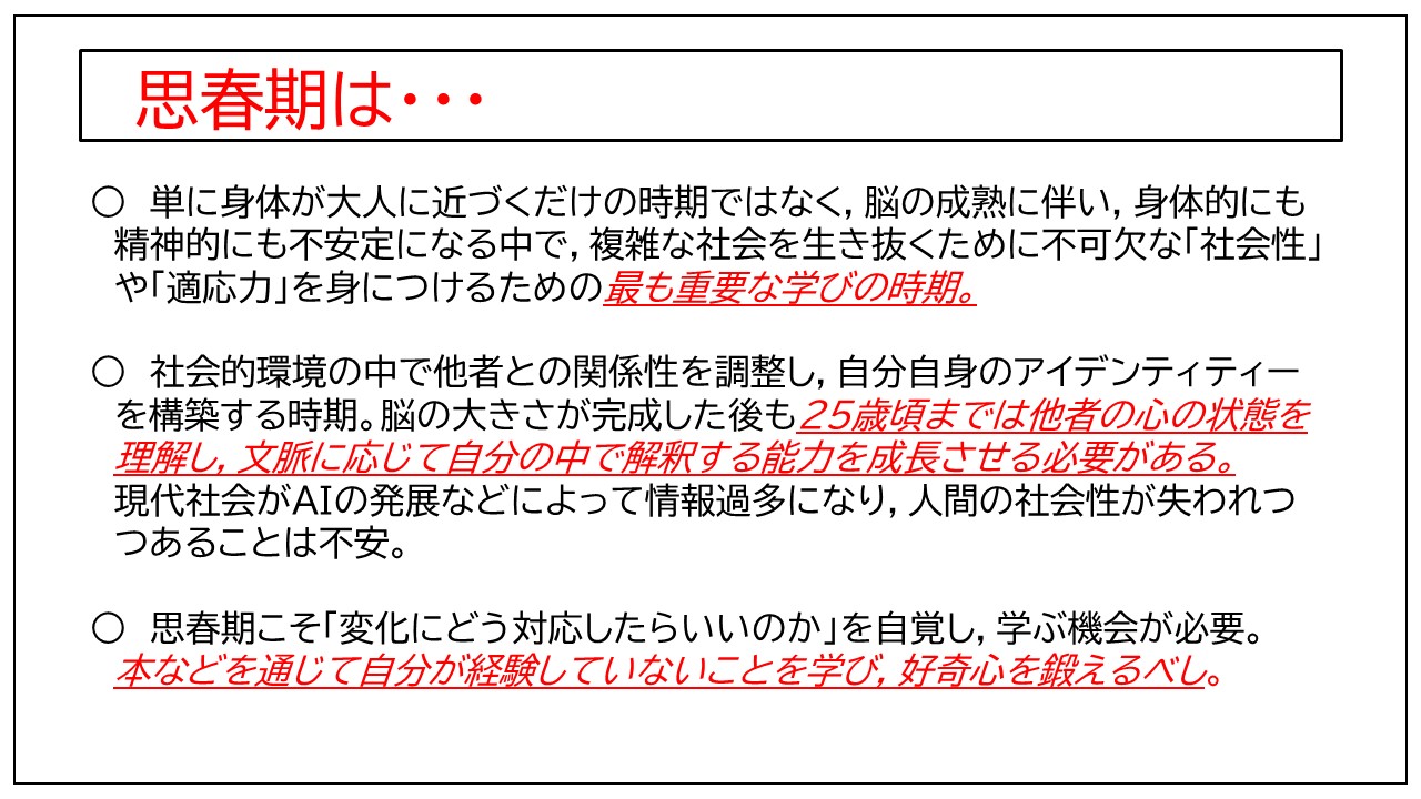 次のスライドは,先生の著書などから「思春期」についてまとめたものです。読んでみますね。思春期は,